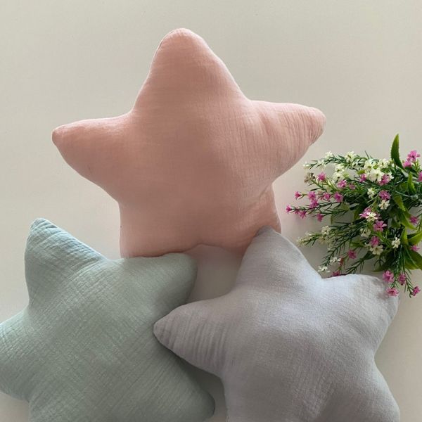 Feitas em musselina suave e delicada, estas almofadas em forma de estrela são perfeitas para dar um toque de ternura e aconchego ao ambiente do seu pequeno tesouro.