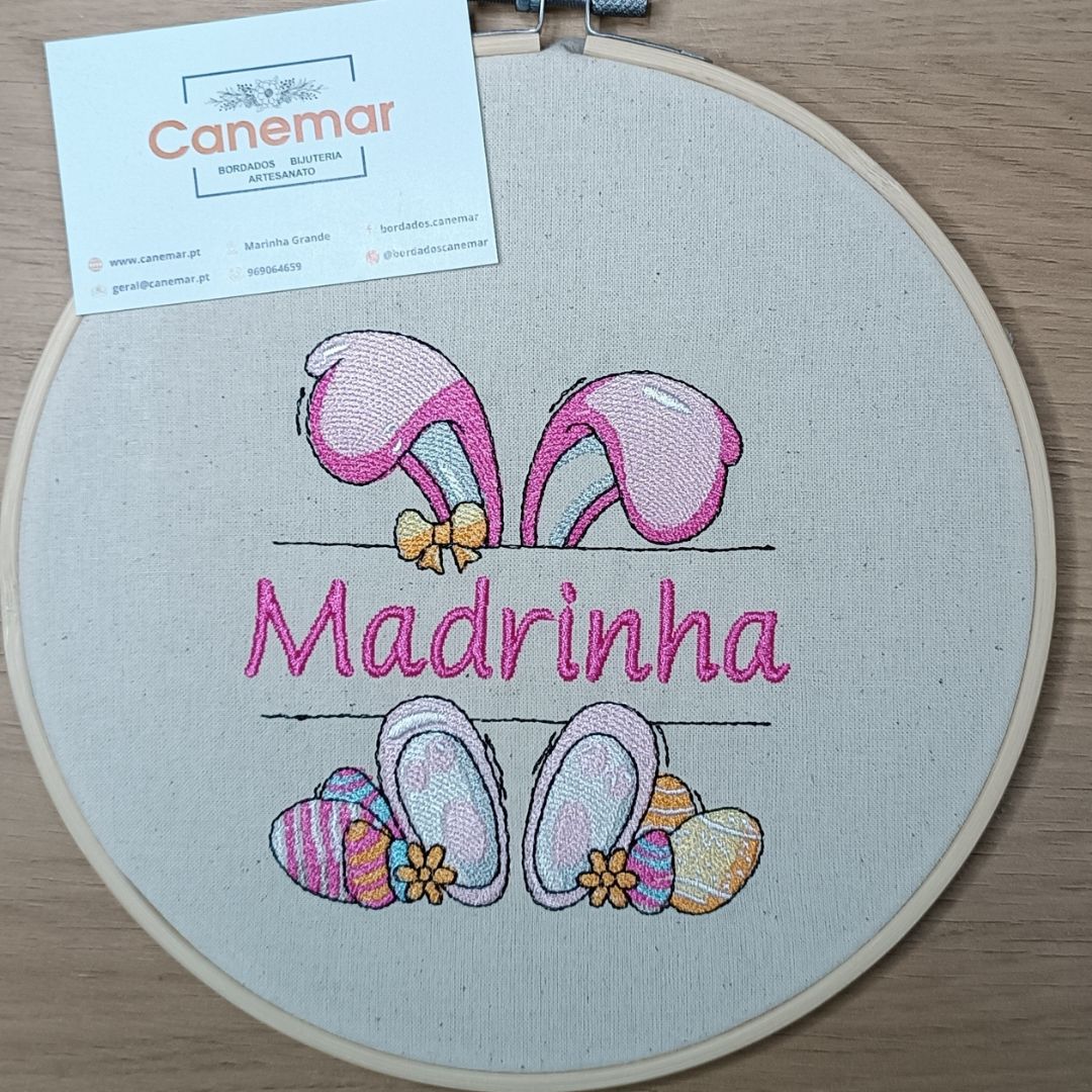 Os nossos bastidores bordados, feitos com precisão, trazem um delicado coelhinho acompanhado da palavra Madrinha / Padrinho / Doce Páscoa, tornando-se uma lembrança única e excepcional.