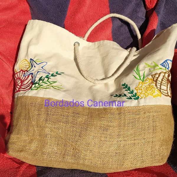 Saco em juta e algodão com várias conchas coloridas bordadas!