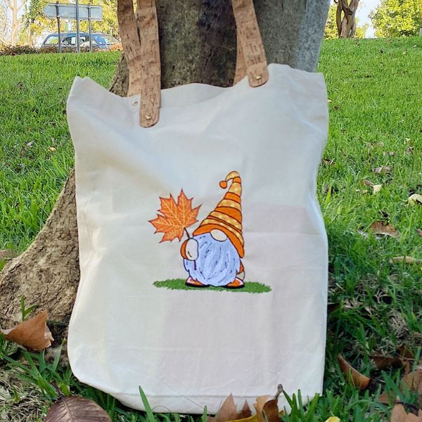 Tote bag em algodão e com alças em cortiça, personalizado com bordado de Gnomo.